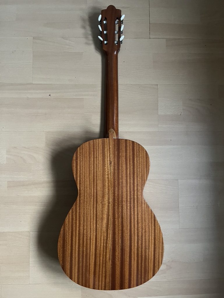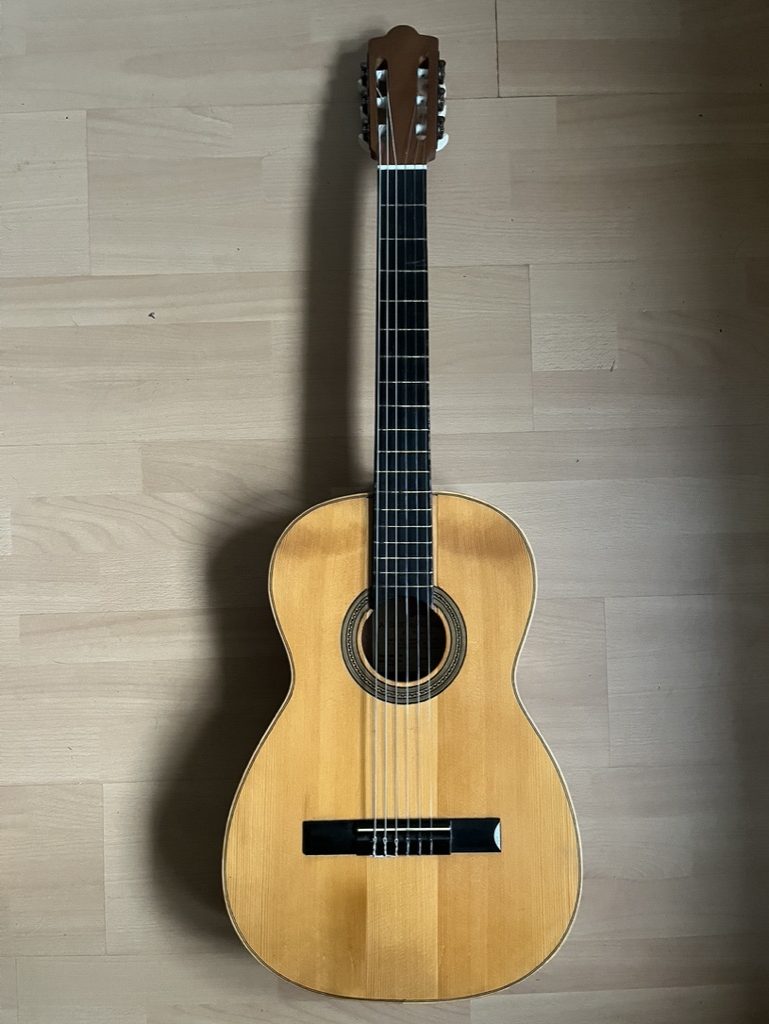 Charming Spanish guitar from the 1950s early 60s. Solid top and real marquetry. All the woods have aged well and some rehydration has been carried out. Smaller, more comfortable body than a standard body, so ideal for folk, picking etc.