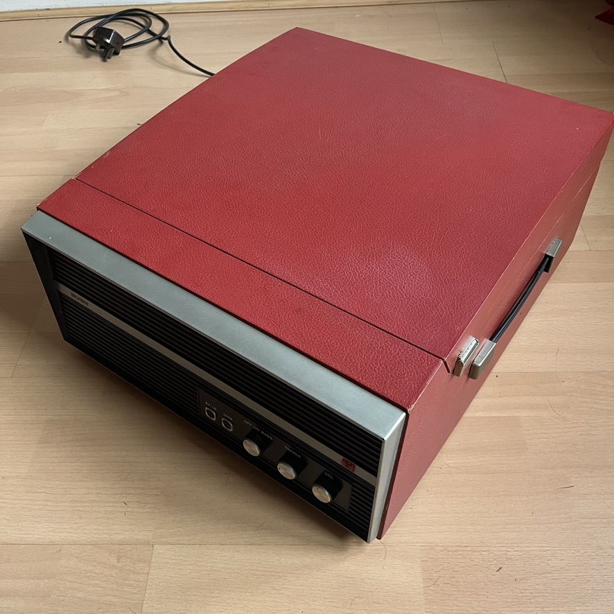 Needs a bit of work. Cosmetically good and the turntable works, as do the dials, buttons etc. The valves glow when switched on. The speaker is pretty quiet with the usual hum. Maybe a bad earth or something. The slant panel over the electronics is missing – just a piece of hardboard so easy to replace. The original 4 deck screws are missing but I’ve put in some replacements to fix it down for shipping. Please see photos for detail and ask if not sure.